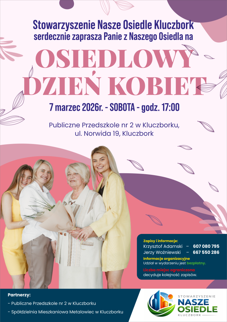 🌷 Serdecznie zapraszamy Panie na Osiedlowy Dzień Kobiet na Naszym Osiedlu w Kluczborku! 🌷 📅 Data: 7 marca 2026 r. 🕔 Godzina: 17:00 📍 Miejsce: Przedszkole Publiczne nr 2 w Kluczborku Wydarzenie organizowane przez Stowarzyszenie Nasze Osiedle Kluczbork