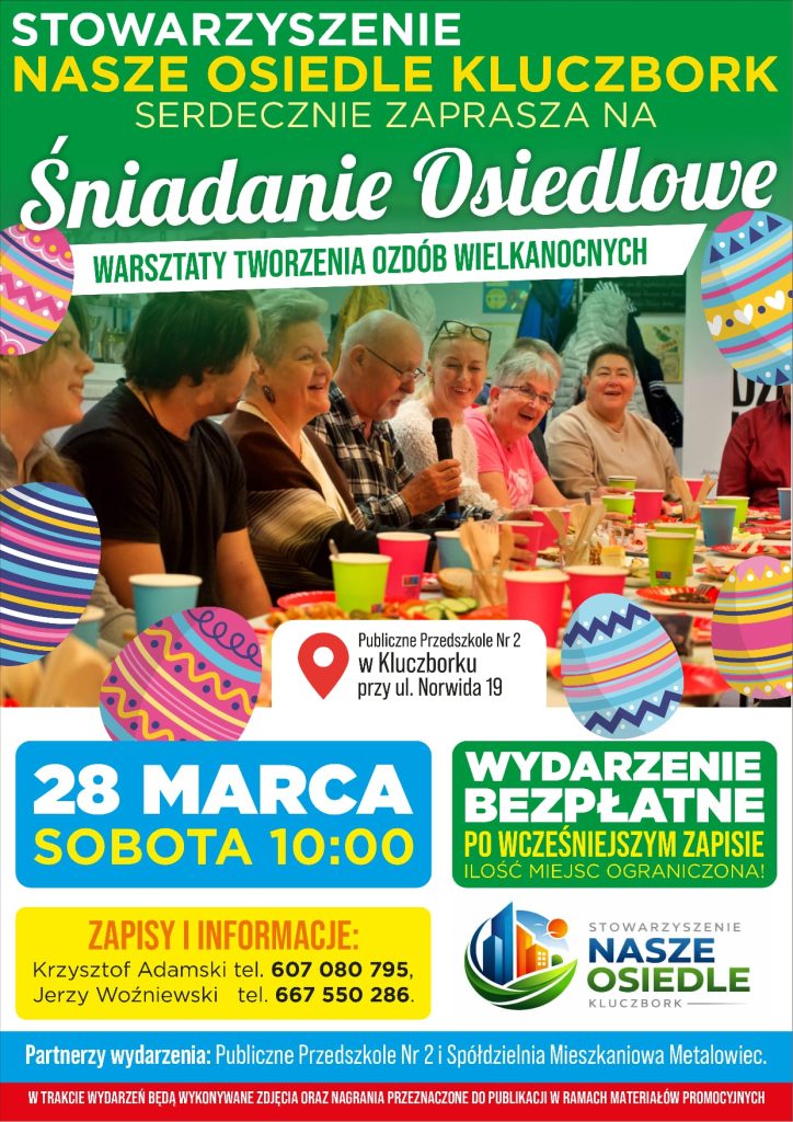Stowarzyszenie Nasze Osiedle Kluczbork serdecznie zaprasza mieszkańców naszego osiedla do udziału w przedświątecznym Śniadaniu Osiedlowym połączonym z tworzeniem ozdób wielkanocnych. To doskonała okazja nie tylko do wspólnego zjedzenia śniadania, ale także do poznania sąsiadów i spędzenia razem miłego, spokojnego poranka w przyjaznej atmosferze. Organizator wydarzenia – Stowarzyszenie Nasze Osiedle Kluczbork – zapewnia bezpłatne produkty spożywcze, dzięki którym każdy będzie mógł samodzielnie przygotować swoje ulubione śniadanie. 🥞 Dla najmłodszych mieszkańców przygotowaliśmy naleśniki z dżemem, Nutellą lub innym pysznym dodatkiem! Po śniadaniu odbędą się warsztaty tworzenia ozdób wielkanocnych.